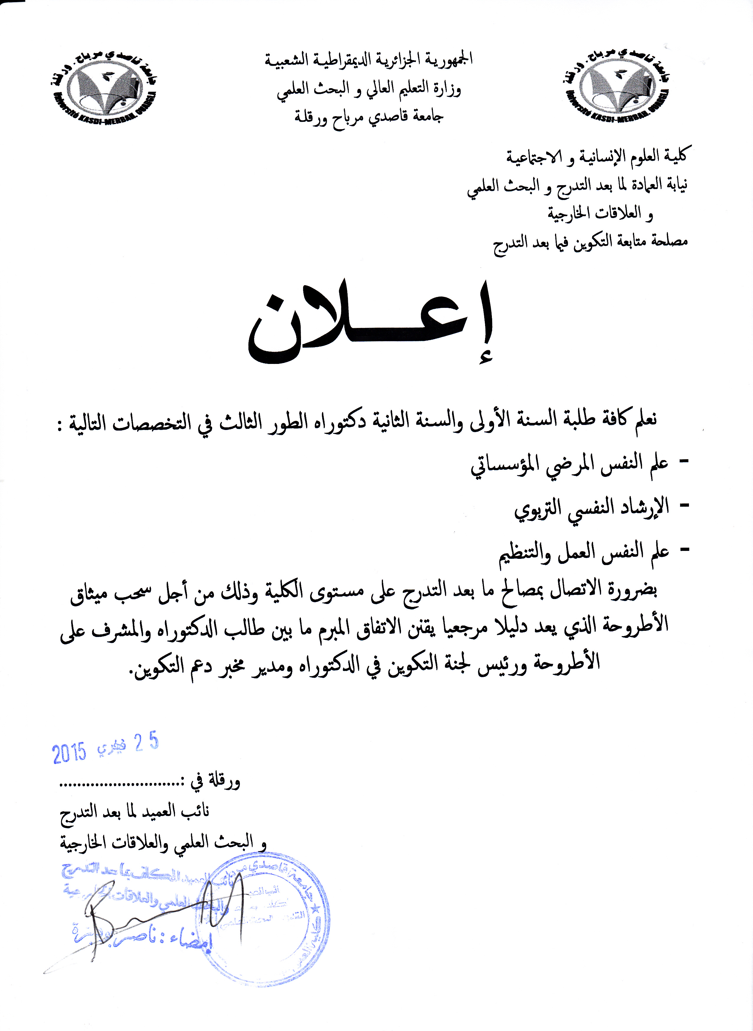 اعلان لطلبة السنة أولى والثانية دكتوراه لكلية العلوم الانسانية والاجتماعية