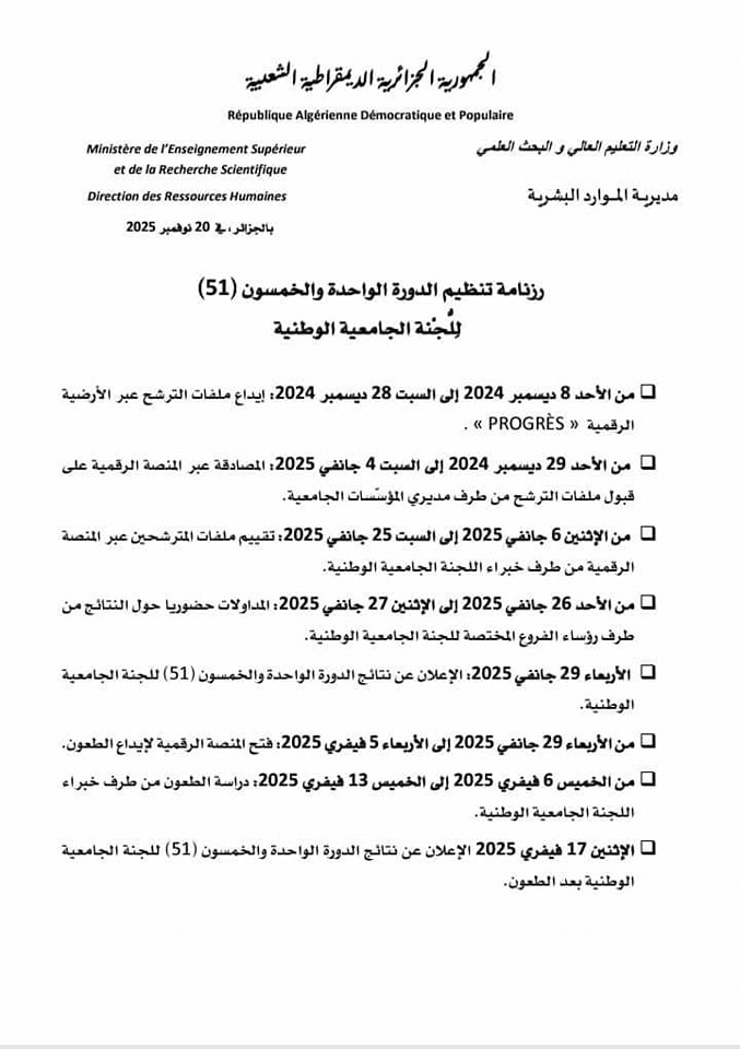 تعلم مديرية الموارد البشرية لوزارة التعليم العالي والبحث العلمي كافة الأساتذةالمحاضرين قسم “أ” عن إفتتاح الدورة الواحدة والخمسون (51 )للجنة الجامعية الوطنية.