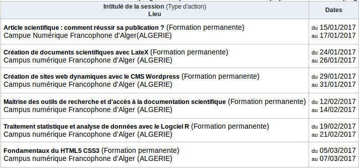 Les premiers ateliers de formation programmés pour les premiers mois de janvier et février 2017.