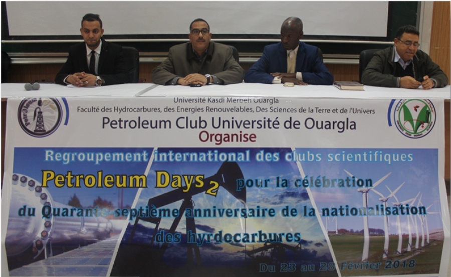 بمناسبة الذكرى السابعة والأربعون لتأميم المحروقات 24 فبراير ينظم نادي المحروقات التابع لكلية المحروقات والطاقات المتجددة وعلوم الأرض والكون التجمع الدولي للأندية العلمية في طبعته الثانية حول موضوع "المزيج الطاقوي" بمشاركة 26 مشاركا من نوادي علمية ومعاهد وجمعيات من مختلف جامعات الوطن وجامعات أجنبية وذلك من 25 إلى 28 فيفري 2018 في ذات الكلية بالقطب الجامعي 03 ، بحضور السيد نائب المدير للعلاقات الخارجية والتعاون والتنشيط والإتصال والتظاهرات العلمية مراد قريشي وعميد والطاقم الاداري والبيداغوجي للكلية وممثلي الشركات البترولية وممثلي السلطات المدنية والعسكرية.