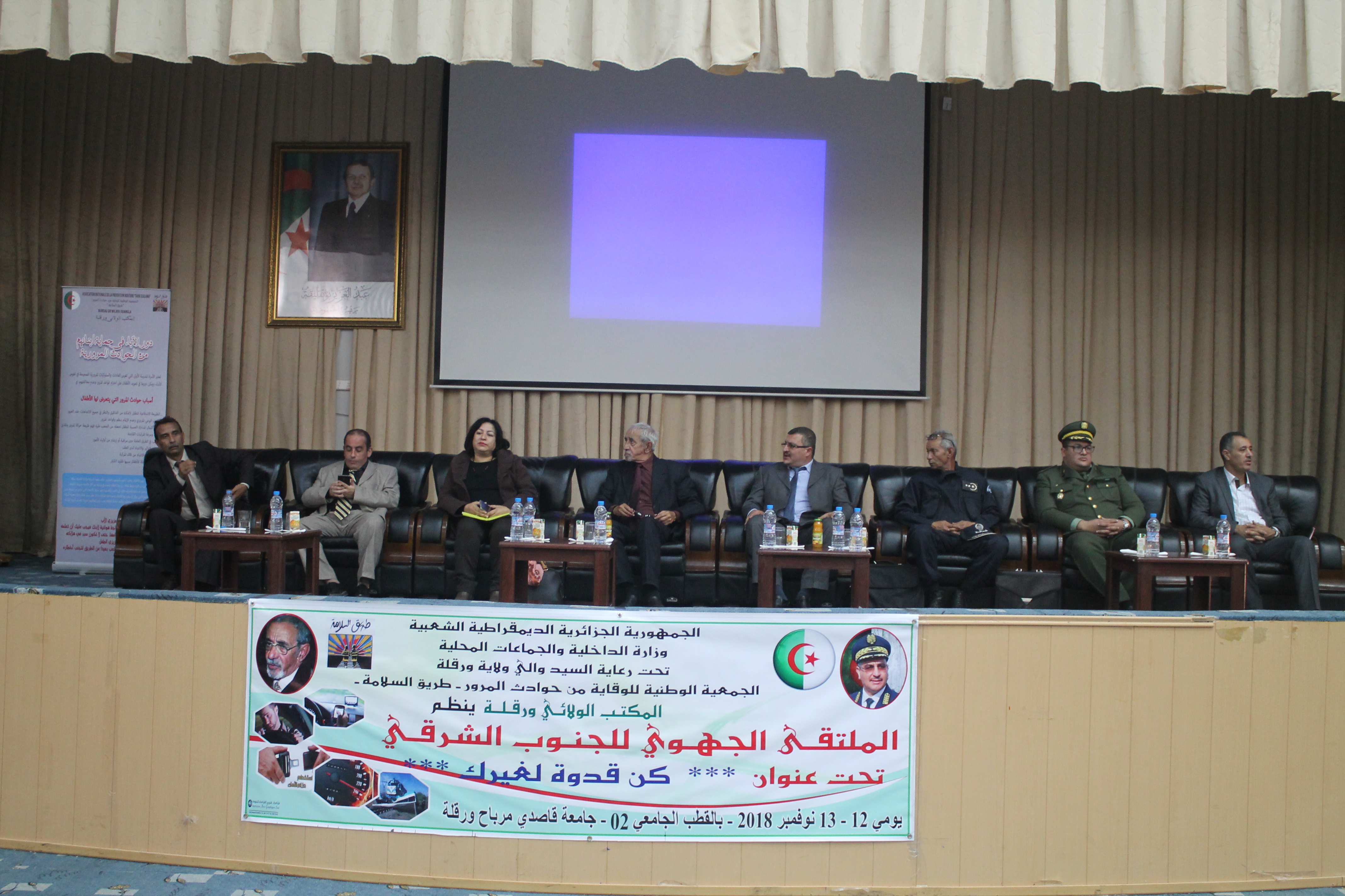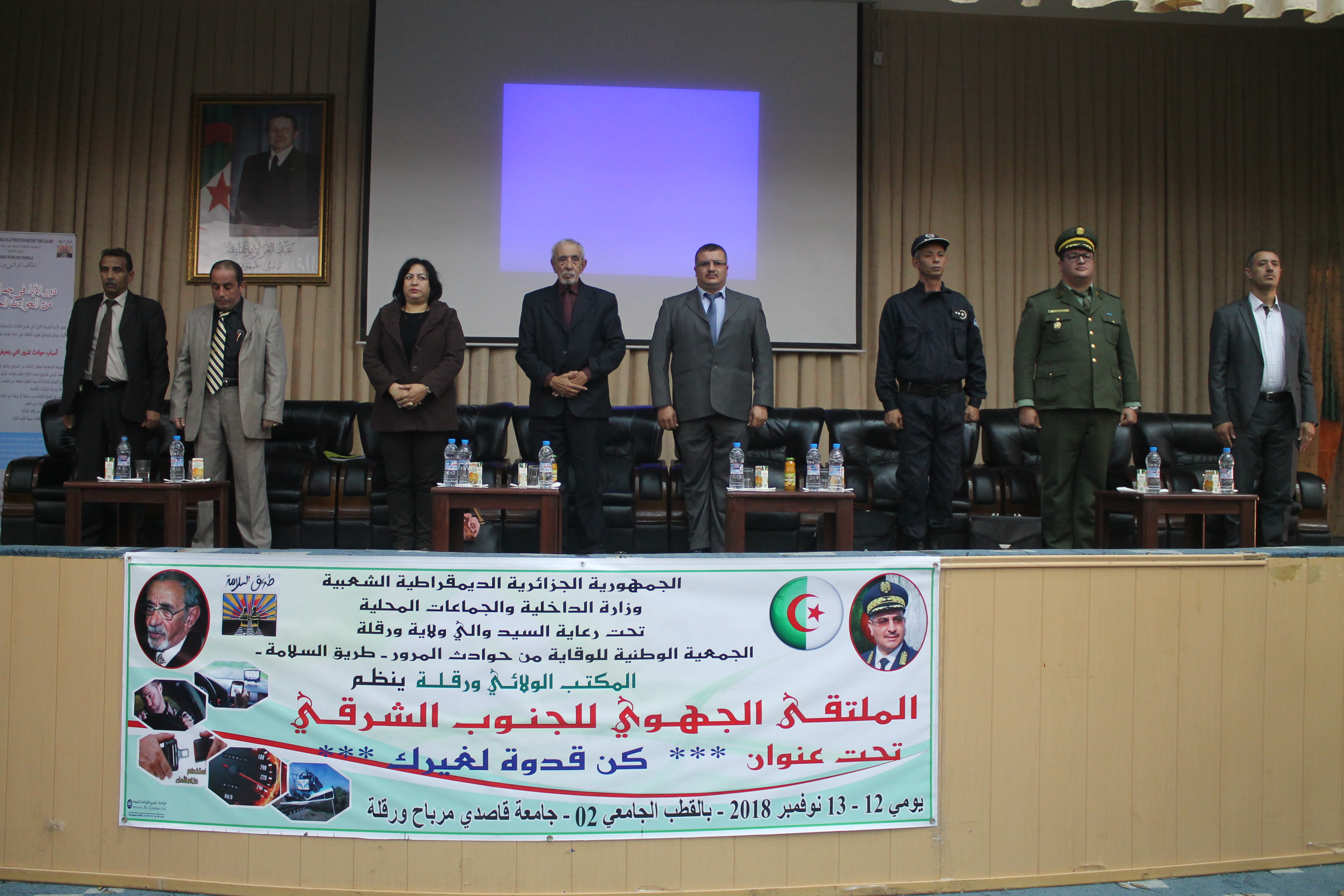 تحت رعاية السيد والي ولاية ورقلة ينظم المكتب الولائي بورقلة للجمعية الوطنية للوقاية من حوادث المرور – طريق السلامة- في جامعة قاصدي مرباح ورقلة الملتقى الجهوي لولايات الجنوب الشرقي تحت شعار "كن قدوة لغيرك" يومي 12 و13 نوفمبر 2018 بقاعة المحاضرات بالقطب الجامعي 02 وهذا بحضور أسلاك قطاع الأمن أعوان الدرك والشرطة والحماية المدنية وجميع الفاعلين (هيئات وأشخاص) في مجال قطاع النقل وأساتذة الجامعة والطلبة والموظفين.