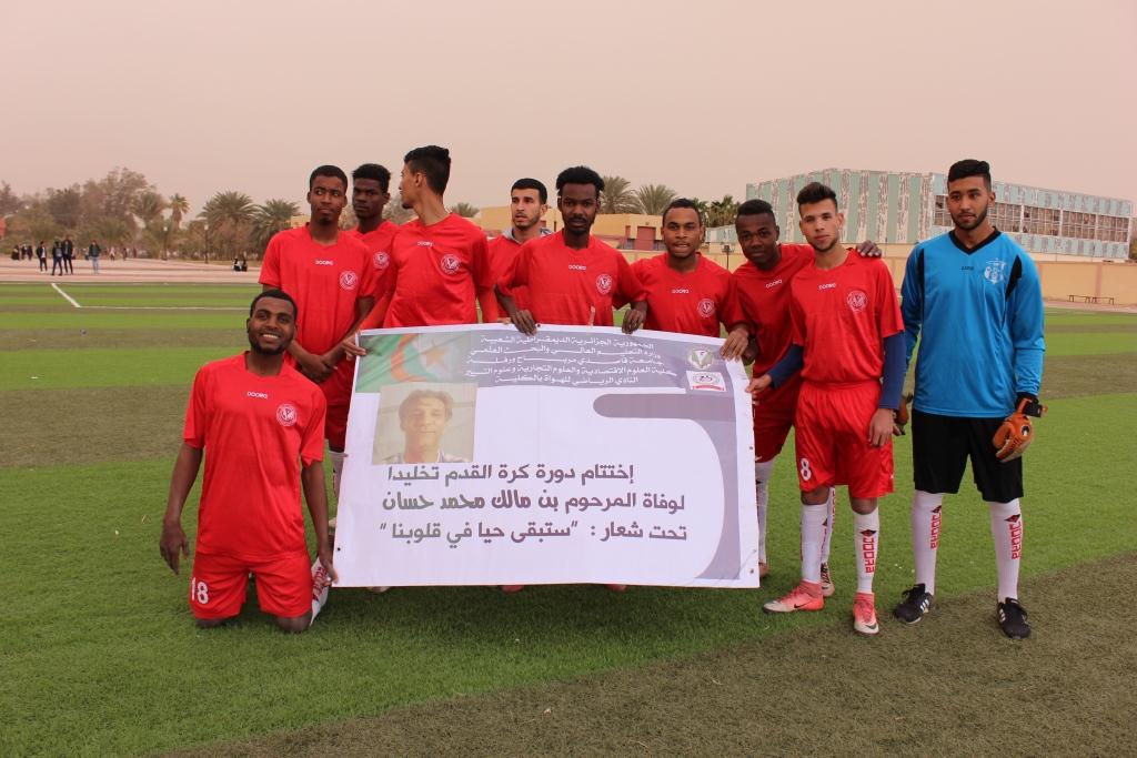 نظم النادي الرياضي للهواة لكلية العلوم الاقتصادية والعلوم التجارية وعلوم التسيير برئاسة السيد الهاشمي بن عباس دورة رياضية في كرة القدم لطلبة ونوادي الكلية تخليدا لروح الفقيد الأستاذ بن مالك محمد حسان، وكانت المباراة النهائية في هذه الدورة يوم الثلاثاء 26 فيفري 2019 على الساعة الرابعة بملعب مديرية جامعة قاصدي مرباح ورقلة بحضور عائلة الفقيد المتمثلة في أبنائه وزملاء العمل وطلبة الجامعة عربون محبة وتضامن مع أسرة الفقيد الأستاذ بن مالك محمد حسان، وجرت المقابلة في روح رياضية عالية حيث فاز الكل بهذه الالتفاتة الطيبة والمبادرة الحسنة كما فازت الأخوة والتضامن على كل الفروقات وكرست مدى الترابط والتلاحم بين مختلف مكونات الأسرة الجامعية.