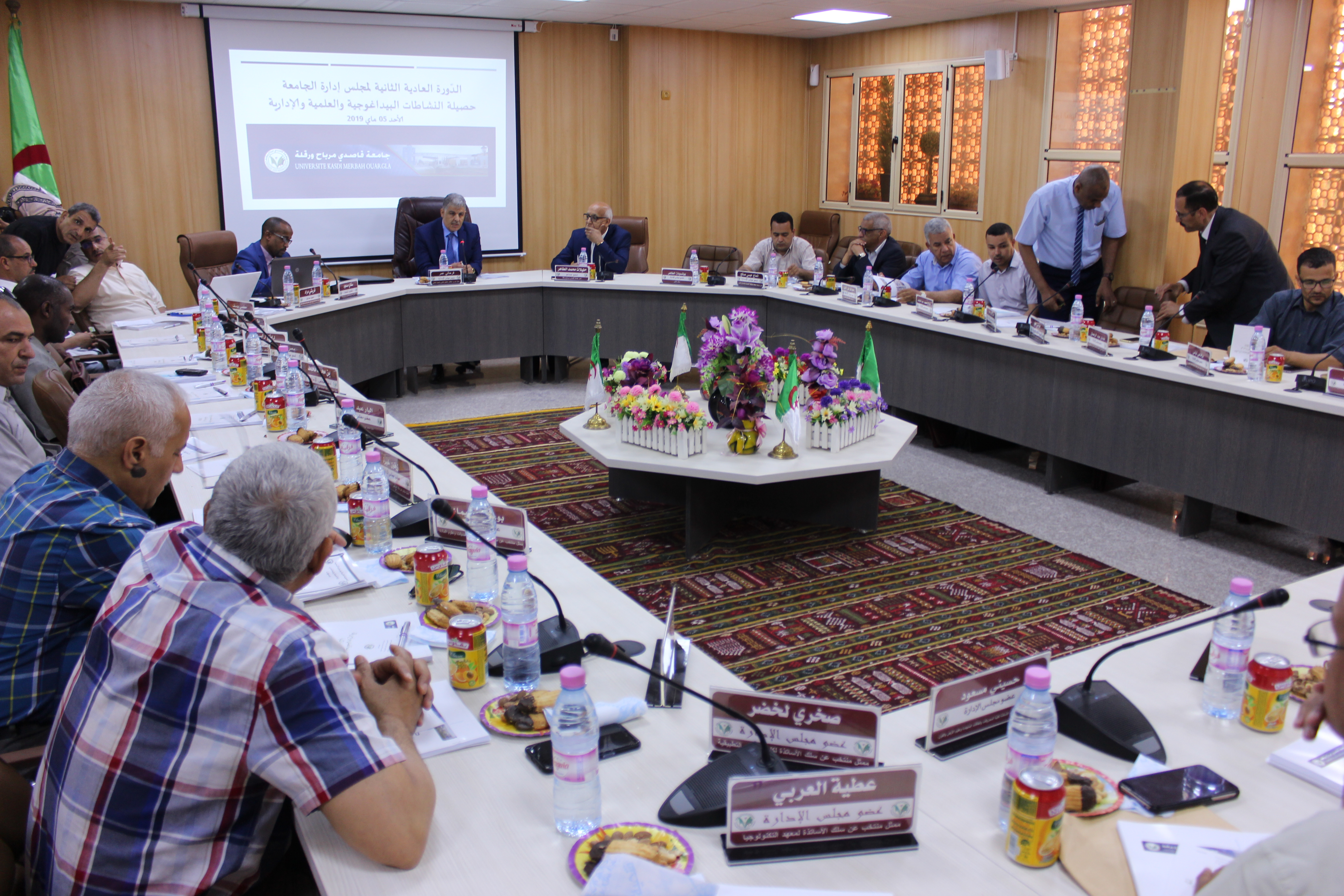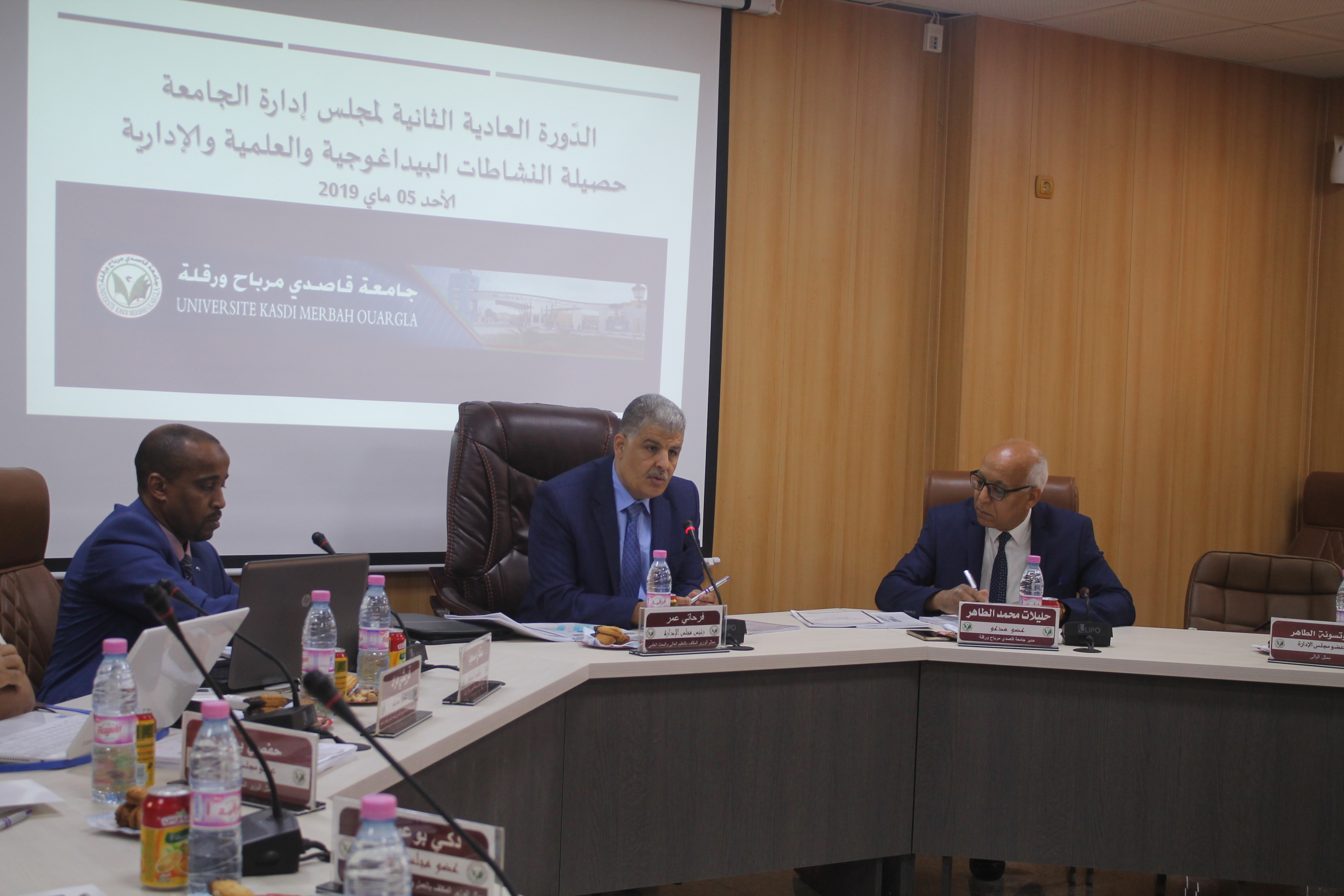 أنعقد مجلس إدارة جامعة قاصدي مرباح ورقلة في دورته العادية الثانية صبيحة يوم 05 ماي 2019 بقاعة الإجتماعات بمديرية الجامعة تحت رئاسة السيد: عمر فرحاتي ممثل لوزير التعليم العالي والبحث العلمي وبحضور السادة أعضاء المجلس ممثلي مختلف القطاعات الوزارية وكذا ممثلي الأساتذة والطلبة إلى جانب دعوة كل من السيد مدير الجامعة والسيد الأمين العام بصفته أمين المجلس والسادة والسيدات عمداء الكليات ومدراء المعاهد بالجامعة.
