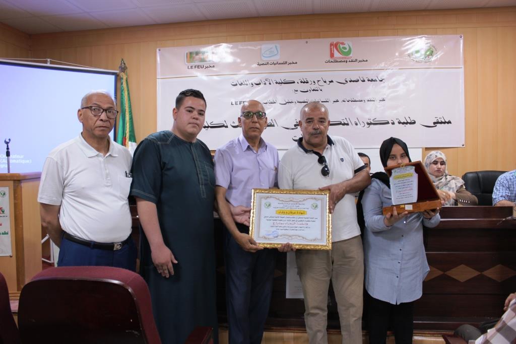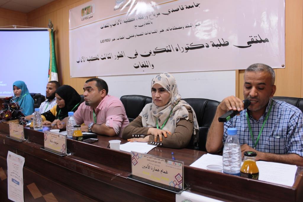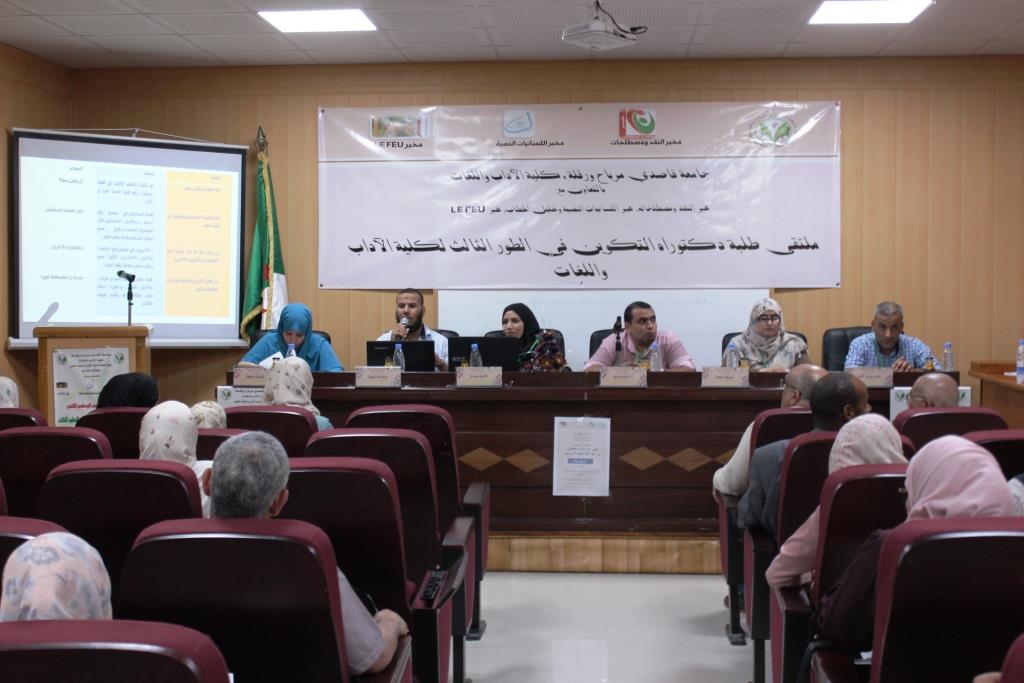 نظمت كلية الآداب واللغات بجامعة قاصدي مرباح ورقلة بالتعاون مع مخبر النقد ومصطلحاته ومخبر اللسانيات النصية وتحليل الخطاب ومخبر LEFEU الملتقى الوطني في طبعته الثانية لطلبة دكتوراه التكوين في الطور الثالث لكلية الآداب واللغات يوم 12 جوان 2019 بقاعة المناقشات بالكلية، حضى الملتقى بحضور السيد مدير الجامعة البروفيسور محمد الطاهر حليلات وعمداء الكليات والمعاهد والطاقم الإداري والبيداغوجي لكلية الآداب واللغات وكذا الطلبة المشاركين وغيرهم.