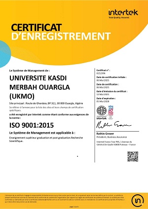 وفاءً لقيمها في الجودة والابتكار، حصلت جامعة ورقلة في عام 2025 على شهادة ISO 9001، نسخة 2015، نظير تطبيق نظامها لإدارة الجودة.