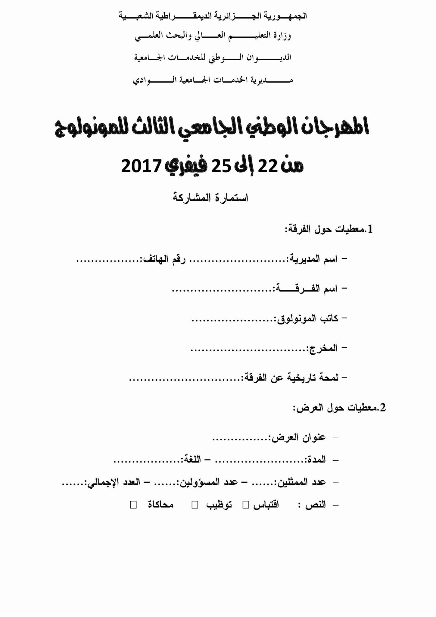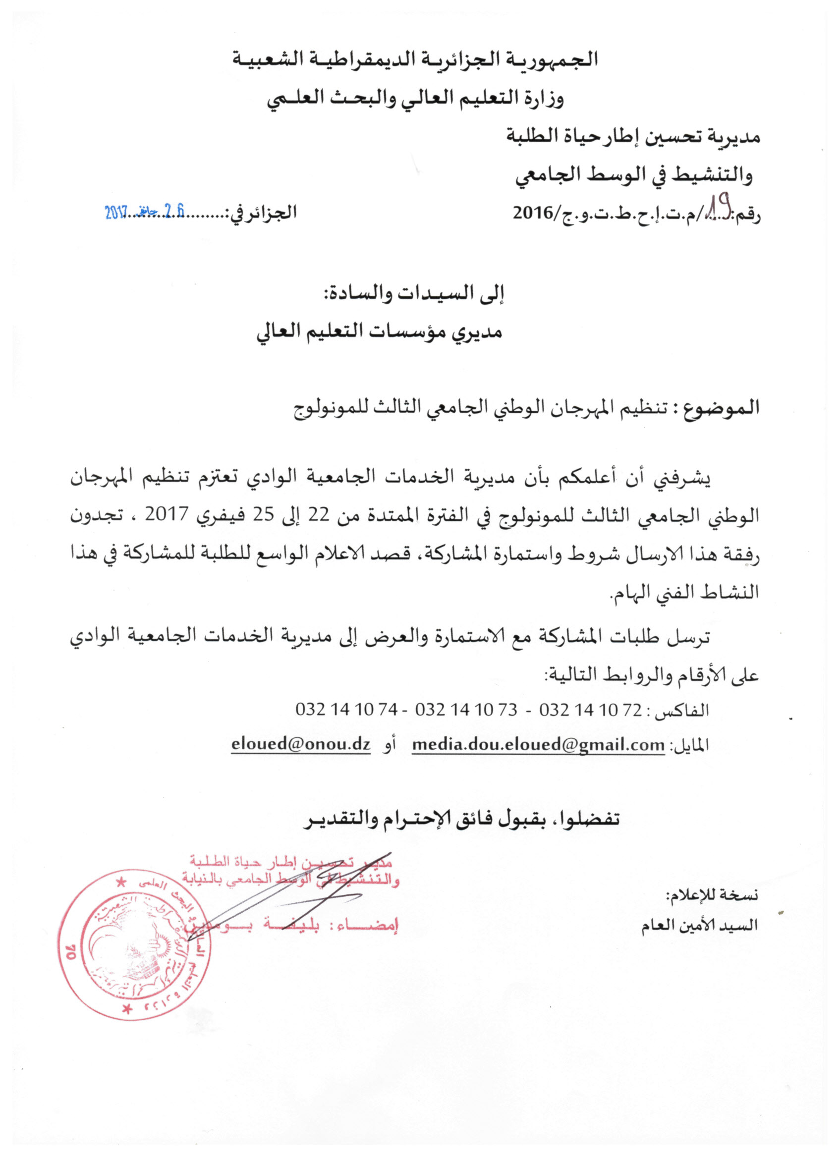 المهرجان الوطني الثالث للمونولوج بمديرية الخدمات الجامعية بالوادي للاعلان والاعلام الواسع للطلبة