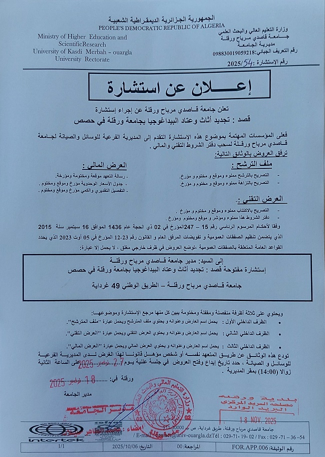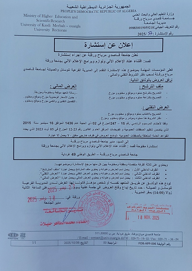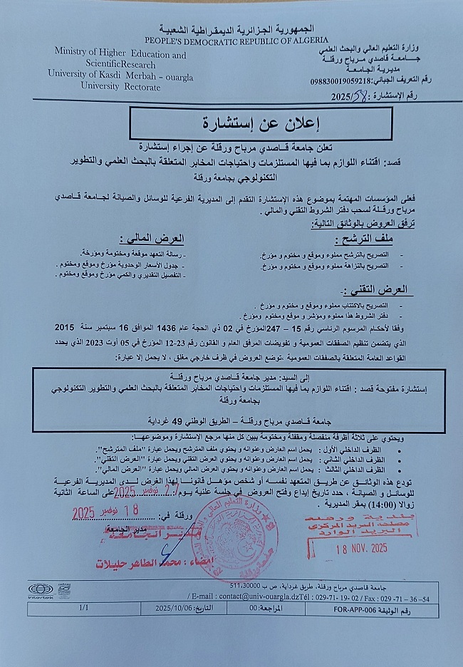 اعلان استشارة ف/ي تأمين الممتلكات والعقارات بجامعة ورقلة