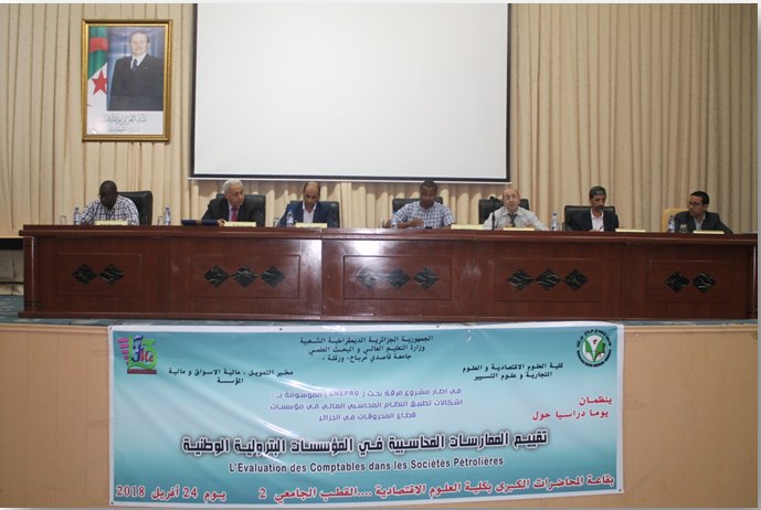 نظمت كلية العلوم الاقتصادية والتجارية وعلوم التسيير ومخبر التمويل، مالية الأسواق ومالية المؤسسة في إطار مشروع فرقة بحث(CNEPRU) الموسومة بـ: إشكالية تطبيق النظام المحاسبي المالي في مؤسسات قطاع المحروقات في الجزائر يوم دراسي حول تقييم الممارسات المحاسبية في المؤسسات البترولية الوطنية يوم 24 أفريل 2018 بقاعة المحاضرات بذات الكلية، بحضور إطارات ومدراء عديد الشركات البترولية الوطنية ومحافظي حسابات والطاقم البيداغوجي والإداري وطلبة الكلية.