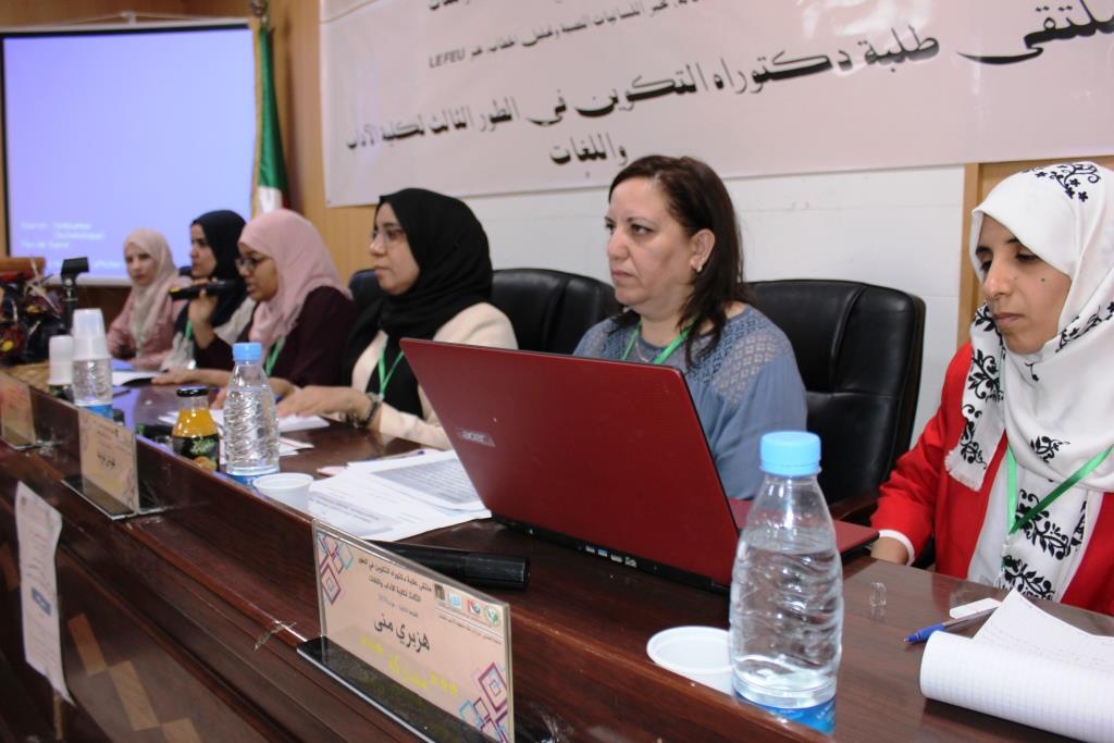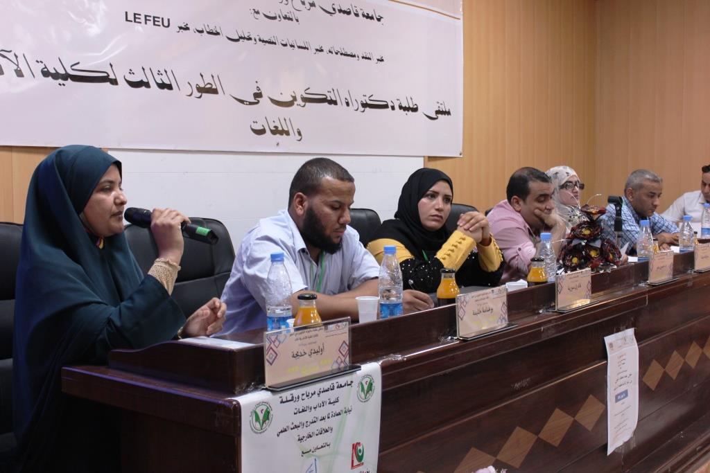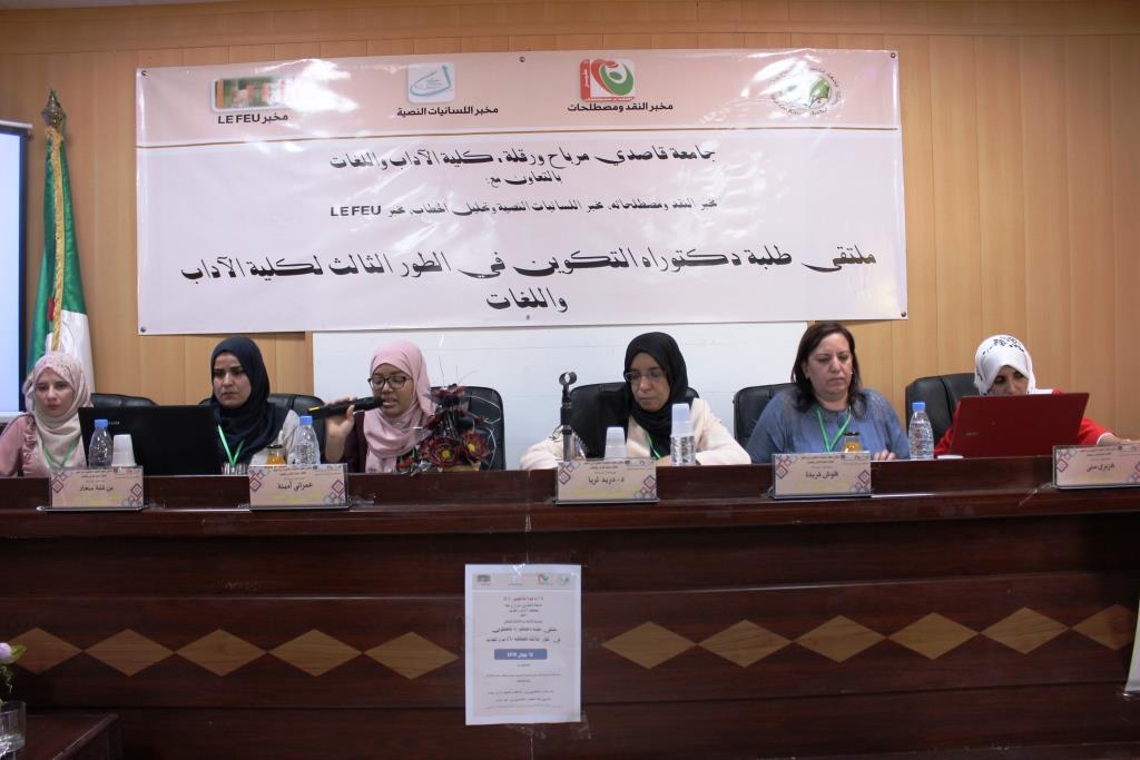 نظمت كلية الآداب واللغات بجامعة قاصدي مرباح ورقلة بالتعاون مع مخبر النقد ومصطلحاته ومخبر اللسانيات النصية وتحليل الخطاب ومخبر LEFEU الملتقى الوطني في طبعته الثانية لطلبة دكتوراه التكوين في الطور الثالث لكلية الآداب واللغات يوم 12 جوان 2019 بقاعة المناقشات بالكلية، حضى الملتقى بحضور السيد مدير الجامعة البروفيسور محمد الطاهر حليلات وعمداء الكليات والمعاهد والطاقم الإداري والبيداغوجي لكلية الآداب واللغات وكذا الطلبة المشاركين وغيرهم.