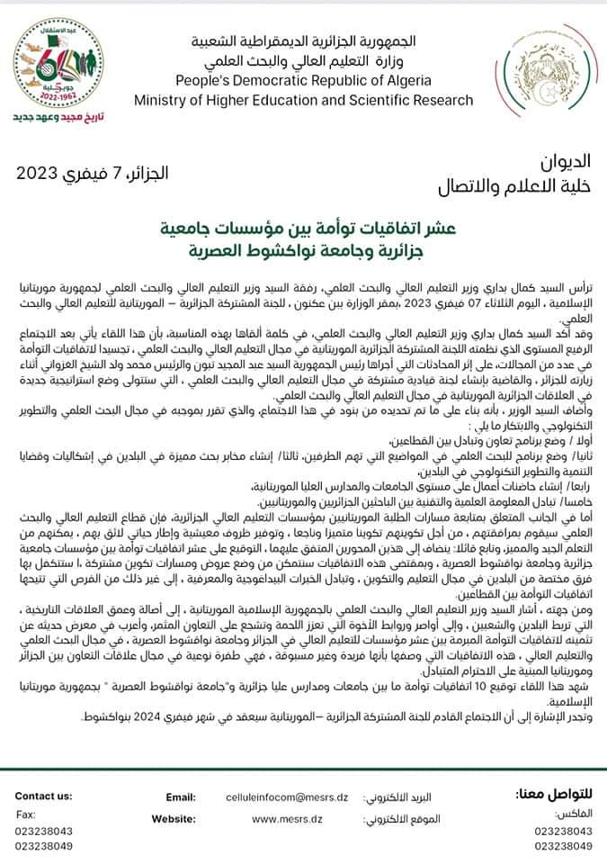 التوقيع على اتفاقيات توأمة بين مؤسسات جامعية جزائرية وجامعة نواكشوط العصرية